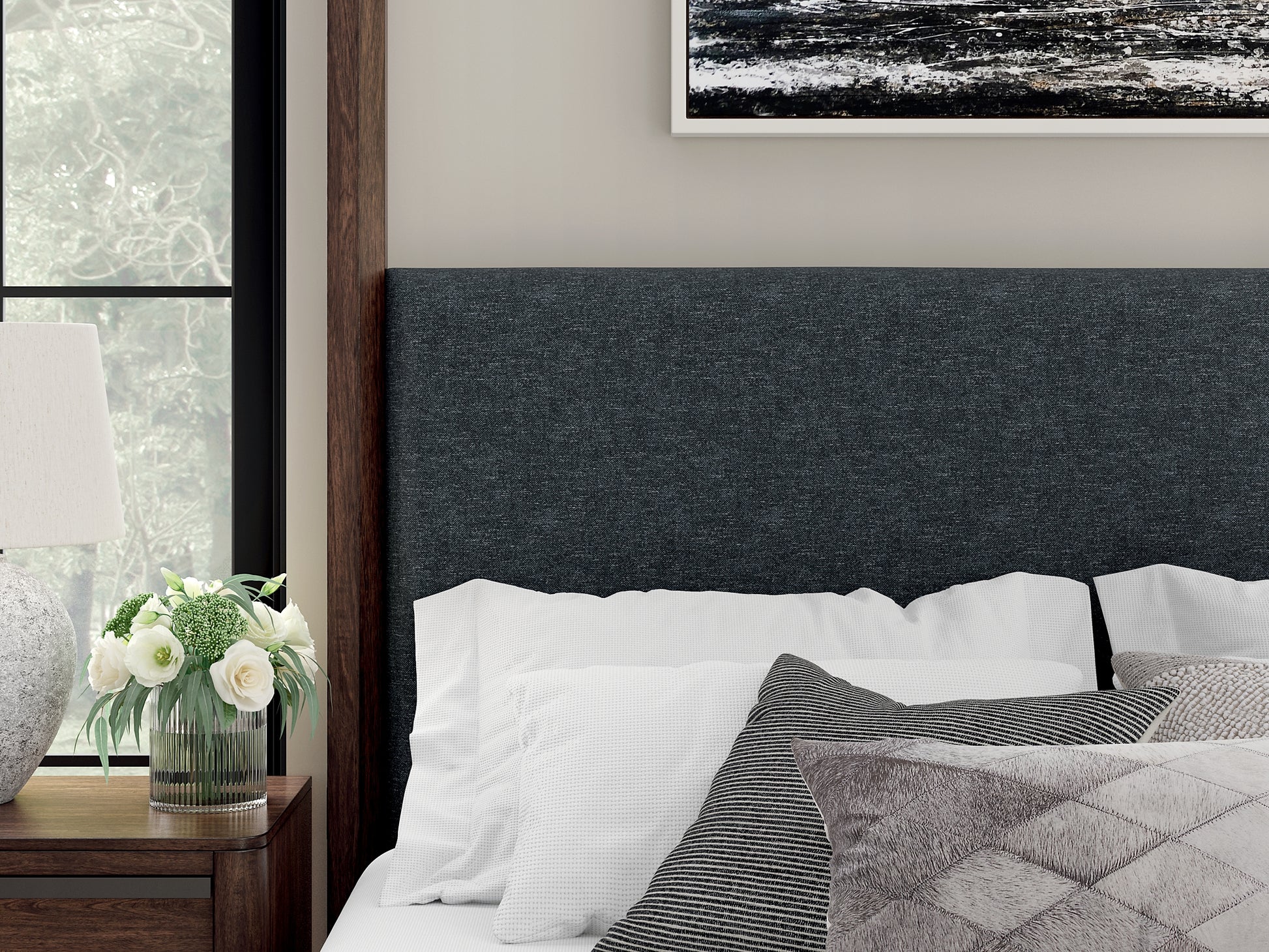 Casual contemporary styling with a decidedly modern vibe. Bathed in a rich dark brown finish, this king canopy bed is warm and inviting, while the integrated “X” canopy and full wrap-around rails set to the floor adorn your restful retreat with on-trend elegance. Dual USB charging on both sides of the upholstered headboard is a subtly cool way to keep your electronics at the ready. What a simply stunning way to achieve the bedroom of your dreams.